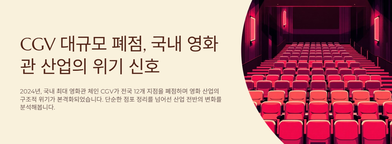 한마디로, 이번 CGV 대규모 폐점은 단순한 점포 정리가 아니라 국내 영화 산업 전체가 처한 위기를 보여주고 있습니다. 흥행작이 부족하고, OTT와의 경쟁에다 관객 감소까지 삼중고가 영화관을 옥죄고 있죠. 앞으로 더 많은 극장이 사라질 수도 있는 상황입니다.