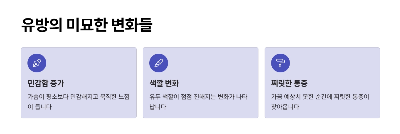 가슴이 묵직하거나 평소보다 민감해지는 경험을 하게 되기도 합니다. 유두 색깔이 진해지거나, 가끔 찌릿한 통증이 함께 나타나기도 하죠.
